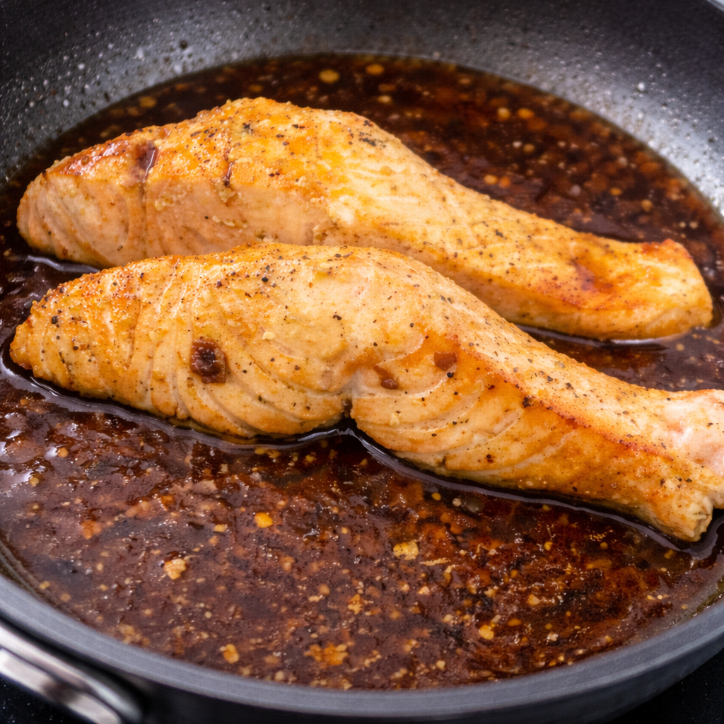 4. Pour thesauce over the salmon. Cook for about 5 minutes until the salmon is cooked through.